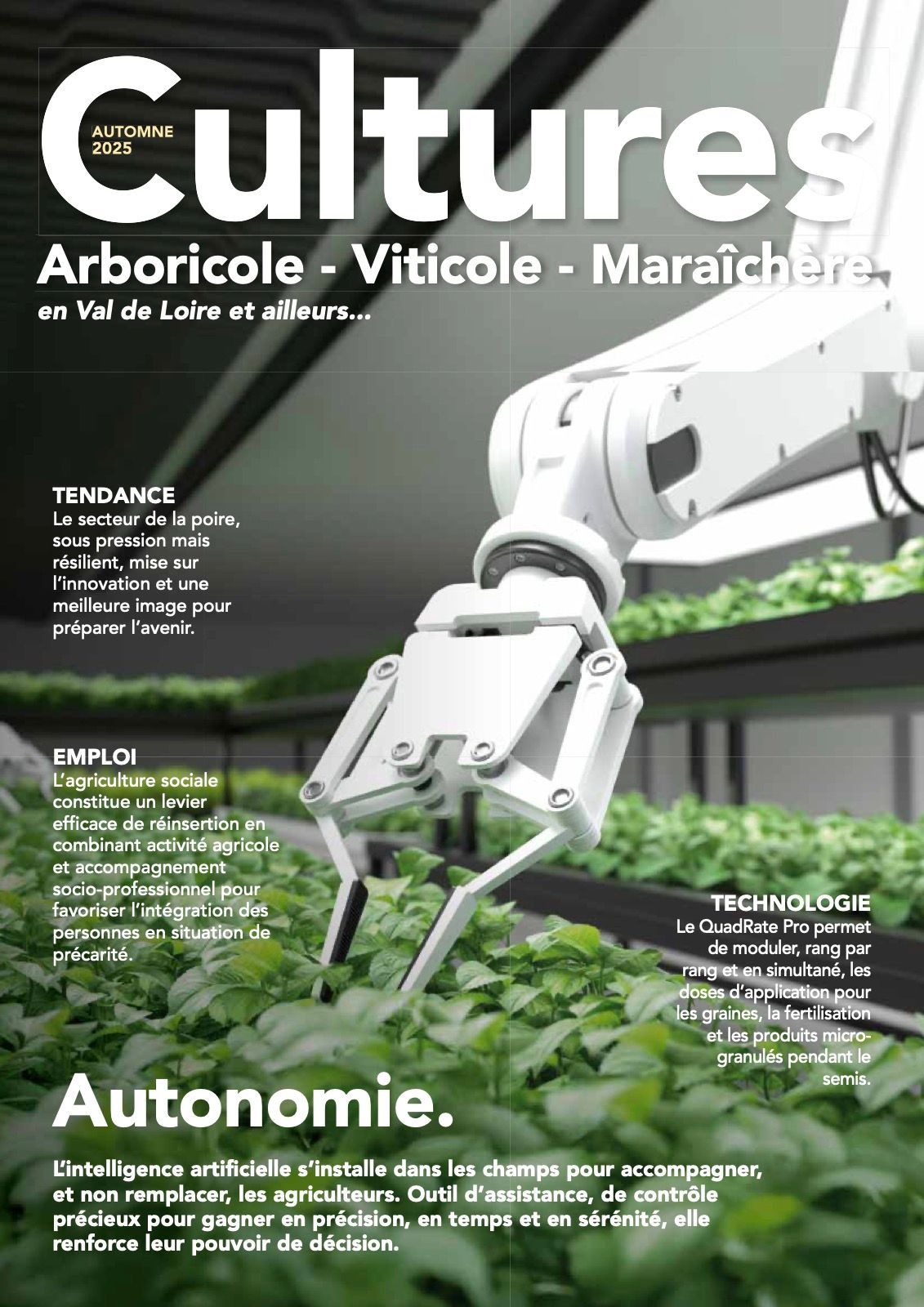 Cultures est un magazine dédié aux professionnels des filières arboricole, viticole et maraîchère. La publication propose un panorama de l’actualité agricole à travers des dossiers de fond, des analyses de tendances, des retours d’expérience et des portraits d’acteurs du secteur. Innovations techniques, évolutions réglementaires, pratiques agricoles, équipements ou marchés : le magazine décrypte les enjeux et transformations du monde agricole. En donnant la parole aux professionnels et en valorisant les initiatives de terrain, il constitue un outil d’information et de veille pour accompagner les acteurs des filières dans leurs activités et leurs évolutions.