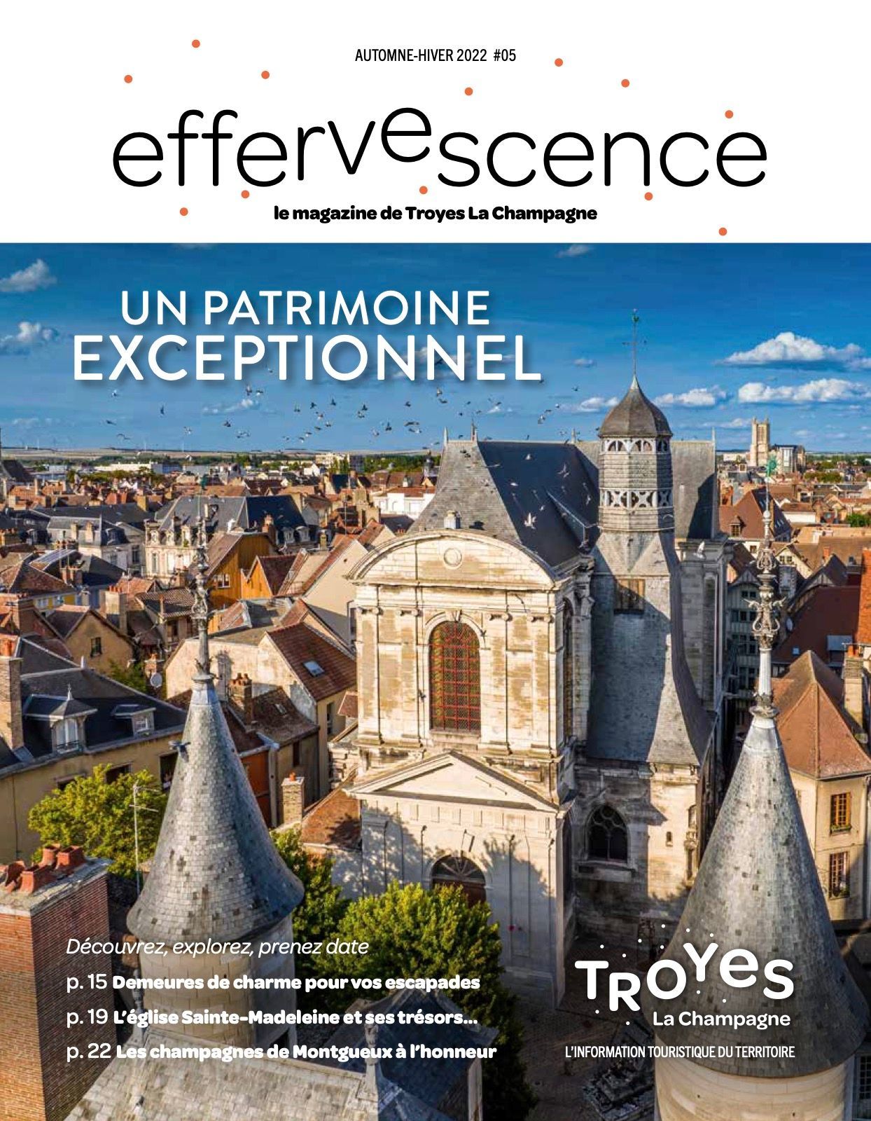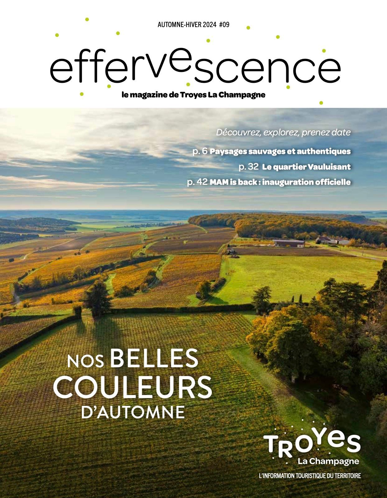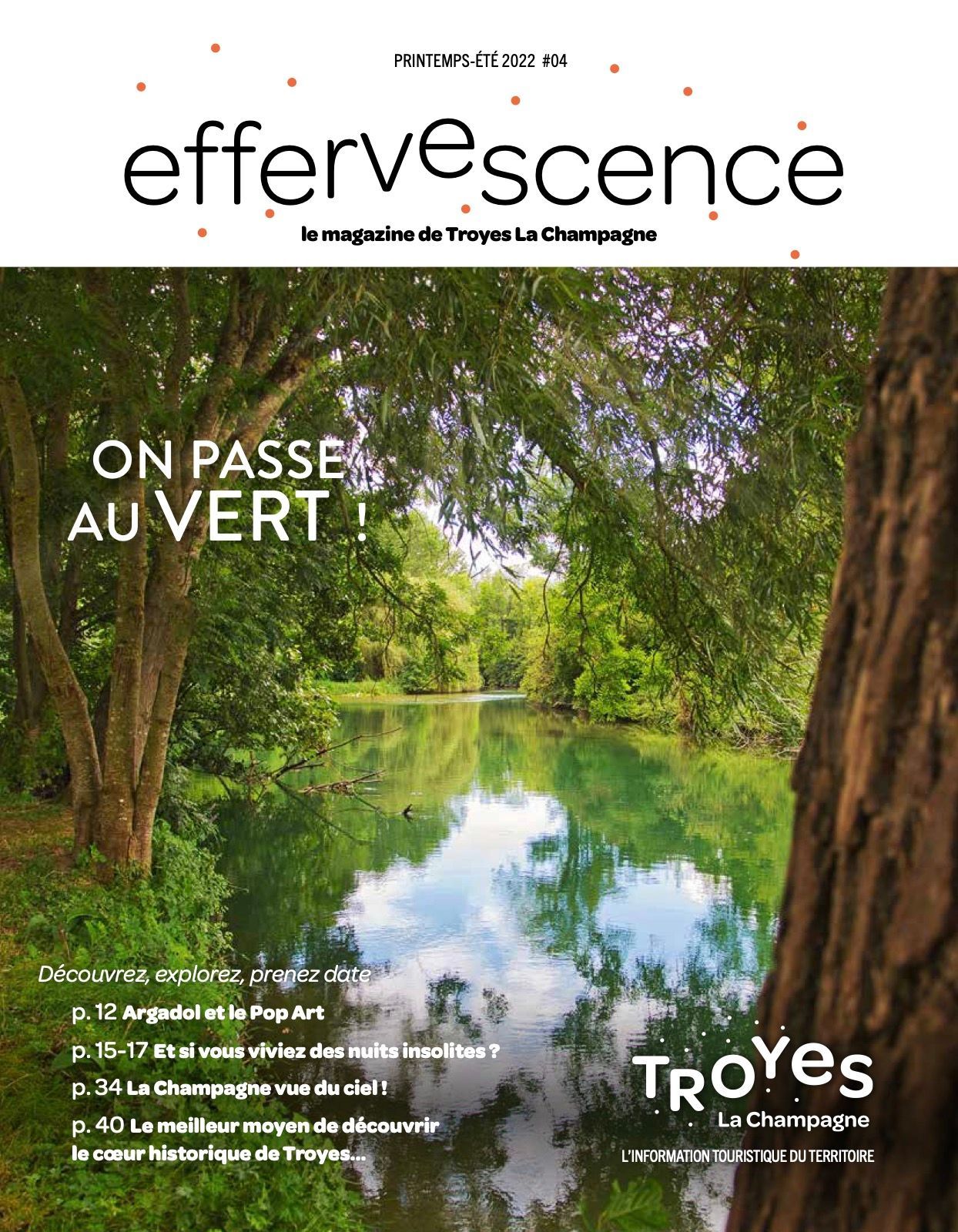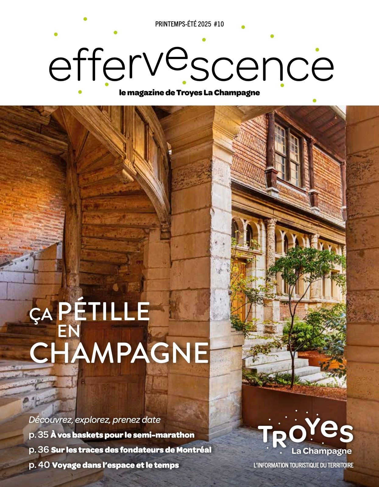 Effervescence est le magazine touristique de Troyes La Champagne. Conçu comme une invitation à la découverte, il met en lumière les richesses patrimoniales, culturelles et naturelles du territoire. À travers reportages, portraits, bonnes adresses et idées de sorties, il valorise les paysages, les savoir-faire, les acteurs locaux et les lieux emblématiques de l’agglomération. Le magazine propose également des suggestions d’expériences, d’activités et d’événements pour explorer la destination autrement. Richement illustré et accessible, Effervescence accompagne habitant·e·s et visiteur·euse·s dans la découverte d’un territoire vivant, entre patrimoine, gastronomie, culture et nature.