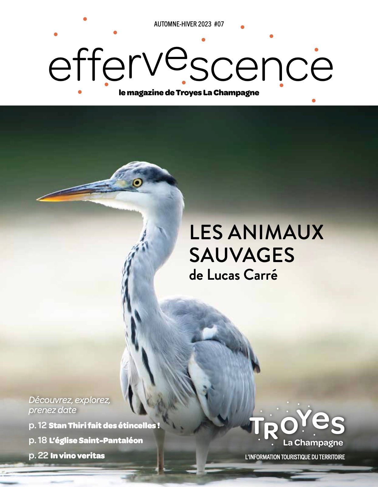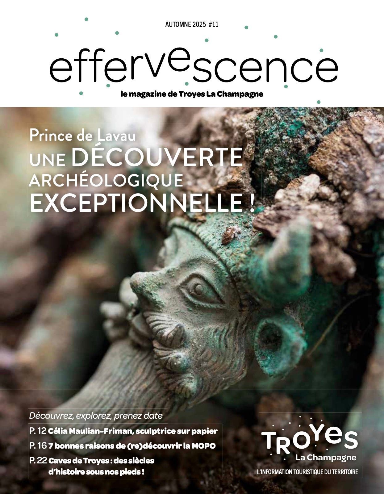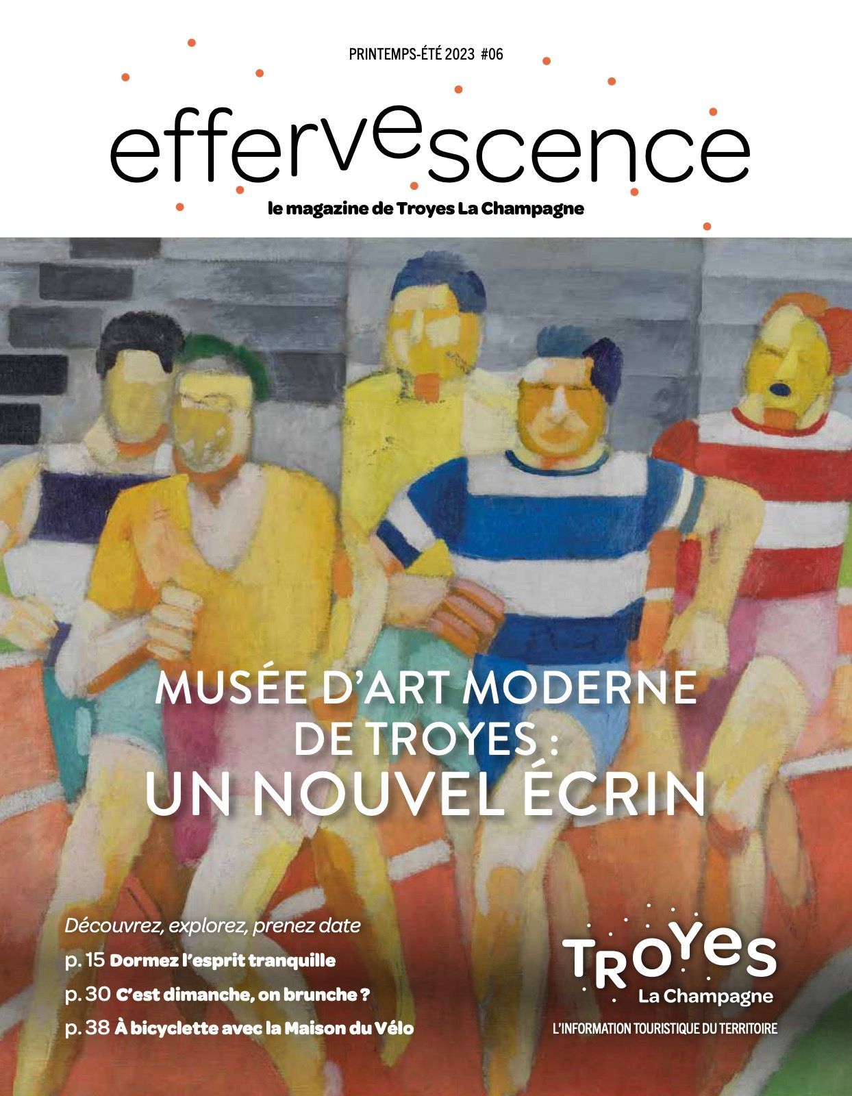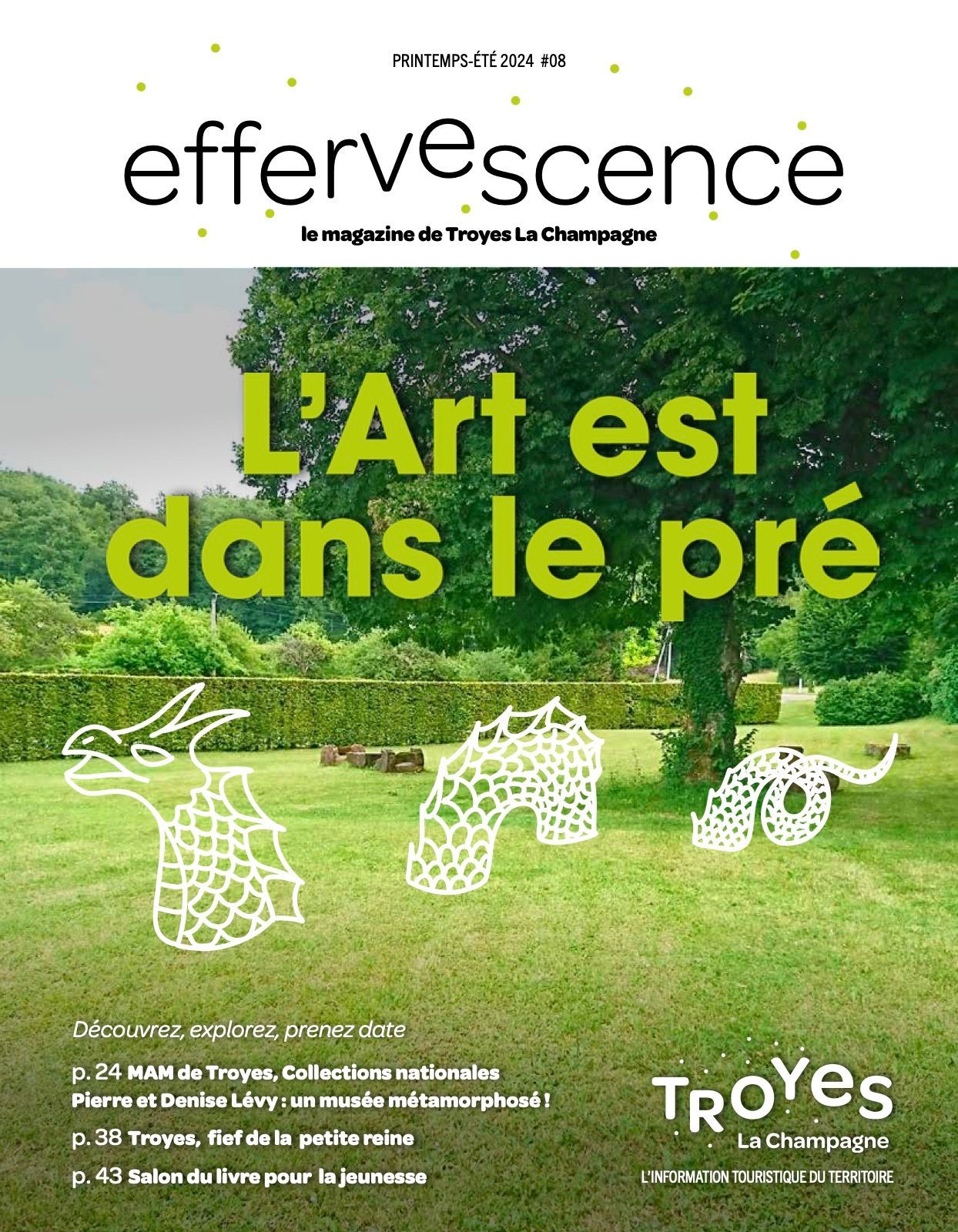 Effervescence est le magazine touristique de Troyes La Champagne. Conçu comme une invitation à la découverte, il met en lumière les richesses patrimoniales, culturelles et naturelles du territoire. À travers reportages, portraits, bonnes adresses et idées de sorties, il valorise les paysages, les savoir-faire, les acteurs locaux et les lieux emblématiques de l’agglomération. Le magazine propose également des suggestions d’expériences, d’activités et d’événements pour explorer la destination autrement. Richement illustré et accessible, Effervescence accompagne habitant·e·s et visiteur·euse·s dans la découverte d’un territoire vivant, entre patrimoine, gastronomie, culture et nature.