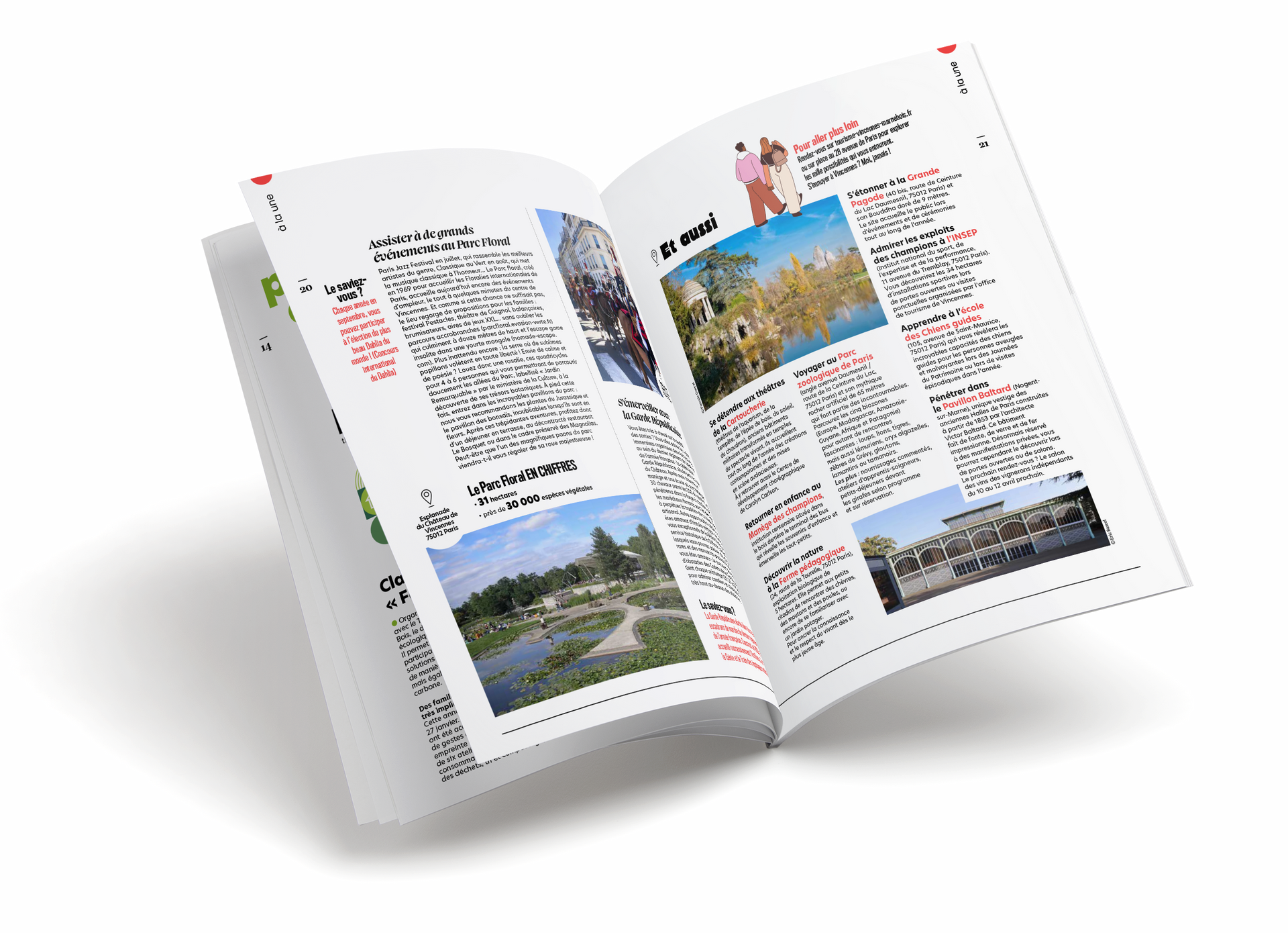 Photographies de terrain, portraits d’habitants, scènes de vie et vues emblématiques de Vincennes : l’iconographie privilégie le réel et la proximité. Mise en lumière grâce à une mise en page rigoureuse, elle vient illustrer les sujets de manière concrète, renforcer l’identité de la ville et soutenir une lecture fluide grâce à des images chaleureuses, variées et fortement contextualisées.