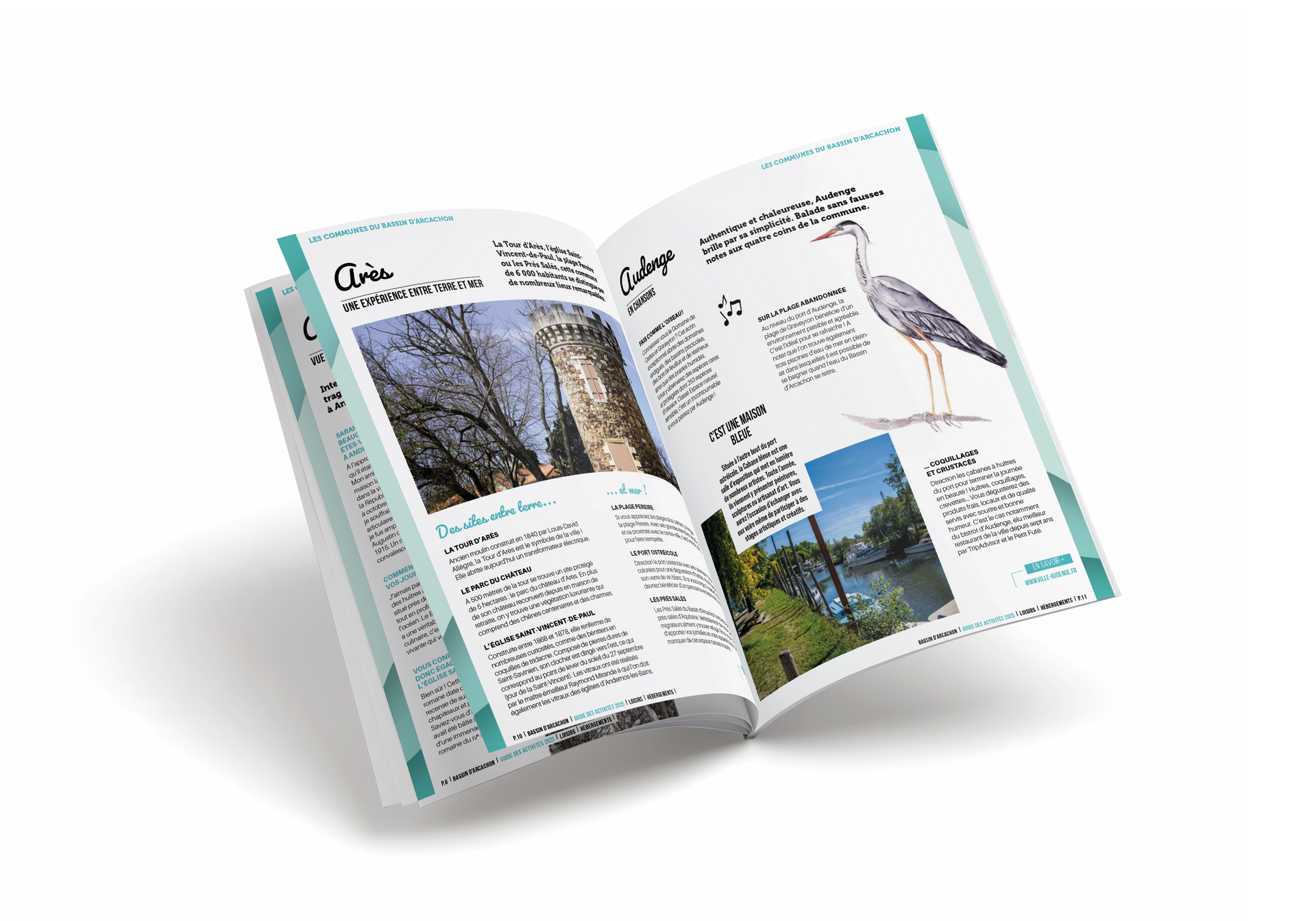 Le guide adopte une couverture lumineuse et attractive, illustrant l’ambiance du Bassin. Choix assumé : privilégier paysages, panoramas et scènes authentiques pour susciter envie, évasion et reconnaissance instantanée.