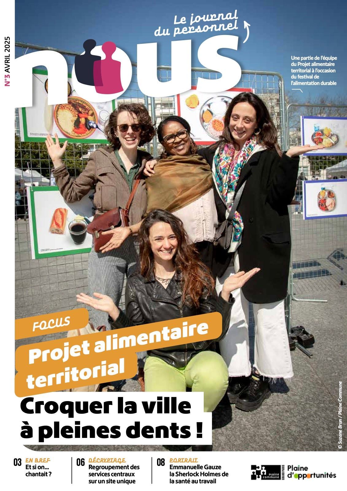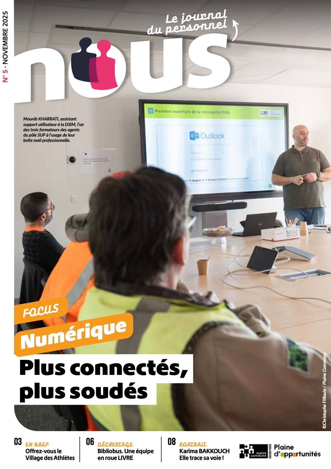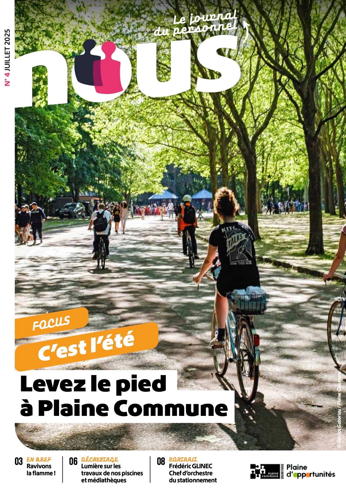 Nous est le journal interne destiné aux agents de Plaine Commune. Ce support d’information valorise la vie de la collectivité, les projets menés par les services et les initiatives portées par les équipes sur le territoire. À travers des dossiers thématiques, des portraits d’agents, des actualités internes ou encore des informations pratiques, la publication favorise le partage d’informations et renforce le sentiment d’appartenance au collectif. Elle met également en lumière les métiers, les compétences et les engagements des agents qui contribuent chaque jour au fonctionnement et à l’évolution de la collectivité.