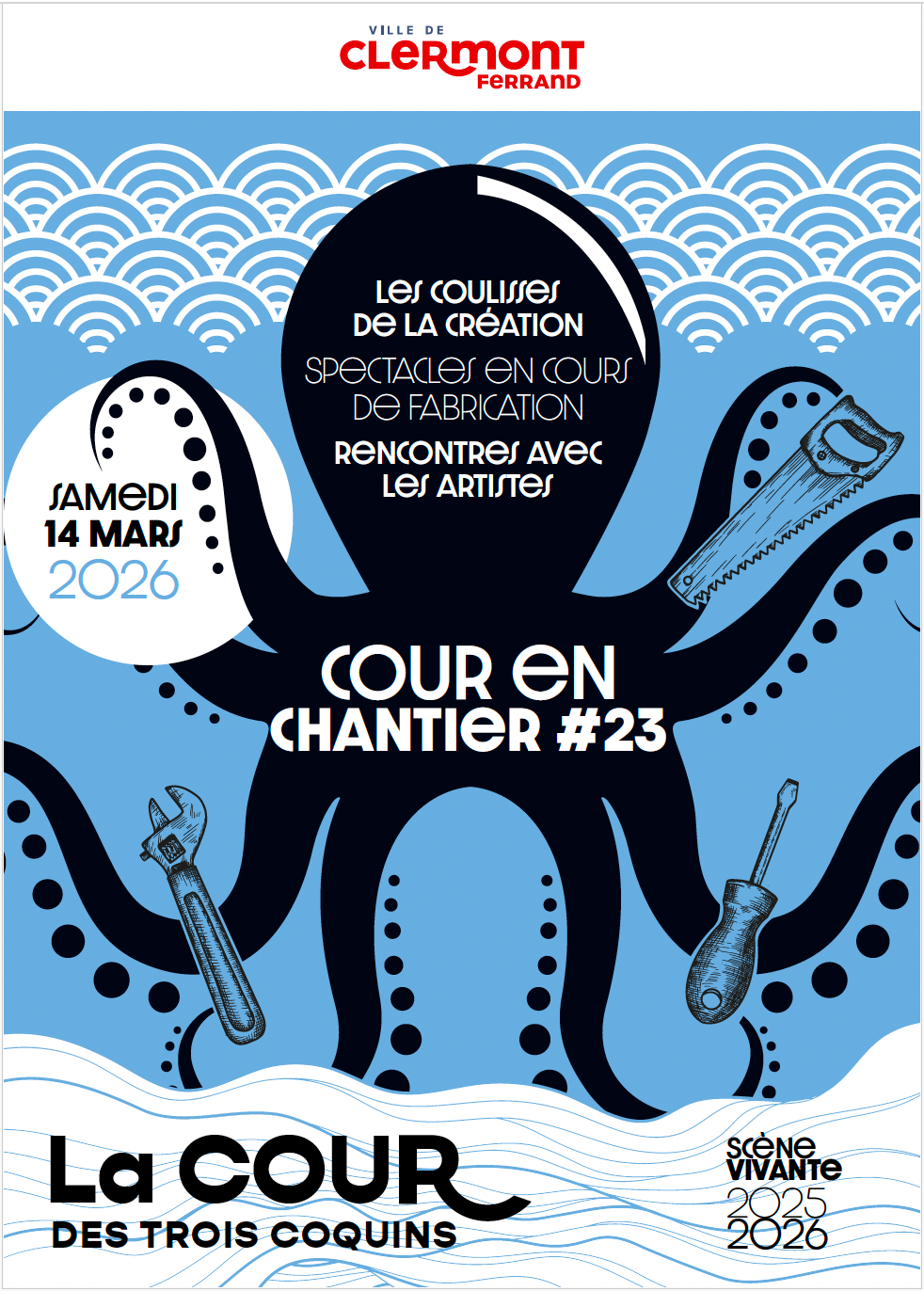 Cette campagne de communication accompagne l’édition 2026 de l’événement « Cour en chantier », organisé par La Cour des Trois Coquins, scène vivante de la Ville de Clermont-Ferrand. Elle a pour objectif d’ouvrir au public les portes du processus de création artistique, à travers la découverte de spectacles en cours de fabrication et des rencontres avec les équipes artistiques. Le dispositif repose sur un flyer événementiel présentant le programme de la journée, les horaires des représentations et les compagnies invitées. Le visuel, construit autour d’une illustration forte et originale mêlant univers marin et outils de fabrication, traduit de manière métaphorique l’idée de chantier artistique. Le ton est à la fois pédagogique, créatif et accessible, en cohérence avec une communication culturelle institutionnelle.