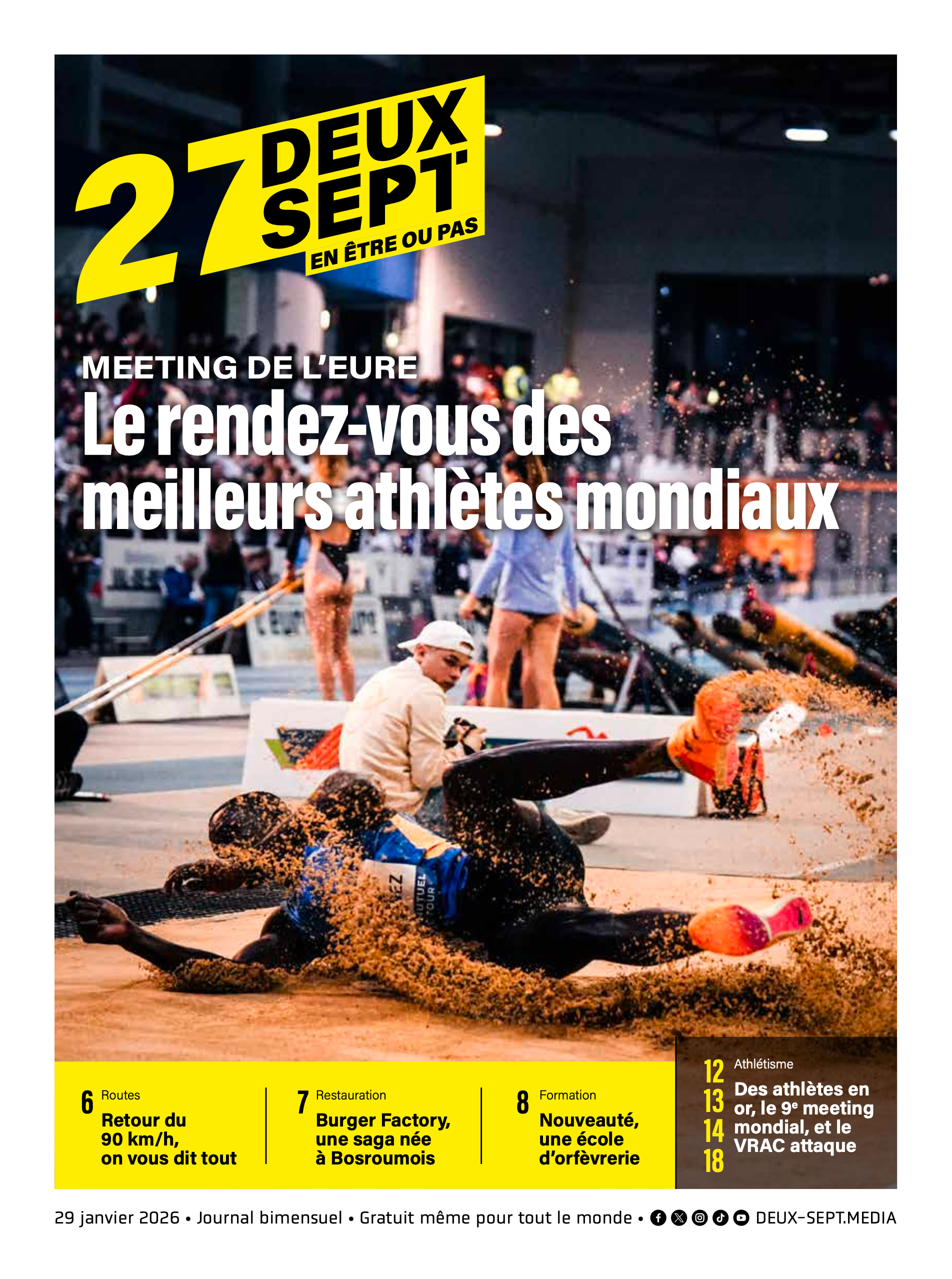 Cette nouvelle édition de Deux Sept, parue le 29 janvier 2026, propose un panorama vivant et engagé de l’actualité euroise. Le dossier central met en lumière le Meeting de l’Eure, rendez-vous sportif majeur réunissant les meilleurs athlètes mondiaux, tout en valorisant les talents locaux. Le magazine aborde également des sujets de société et de proximité, tels que le retour du 90 km/h sur les routes départementales, l’essor d’initiatives économiques locales, la formation, l’emploi et l’innovation. Culture, sport, vie associative, portraits, événements et bonnes adresses rythment ce numéro, offrant une information accessible, dynamique et ancrée dans le quotidien des habitants de l’Eure.