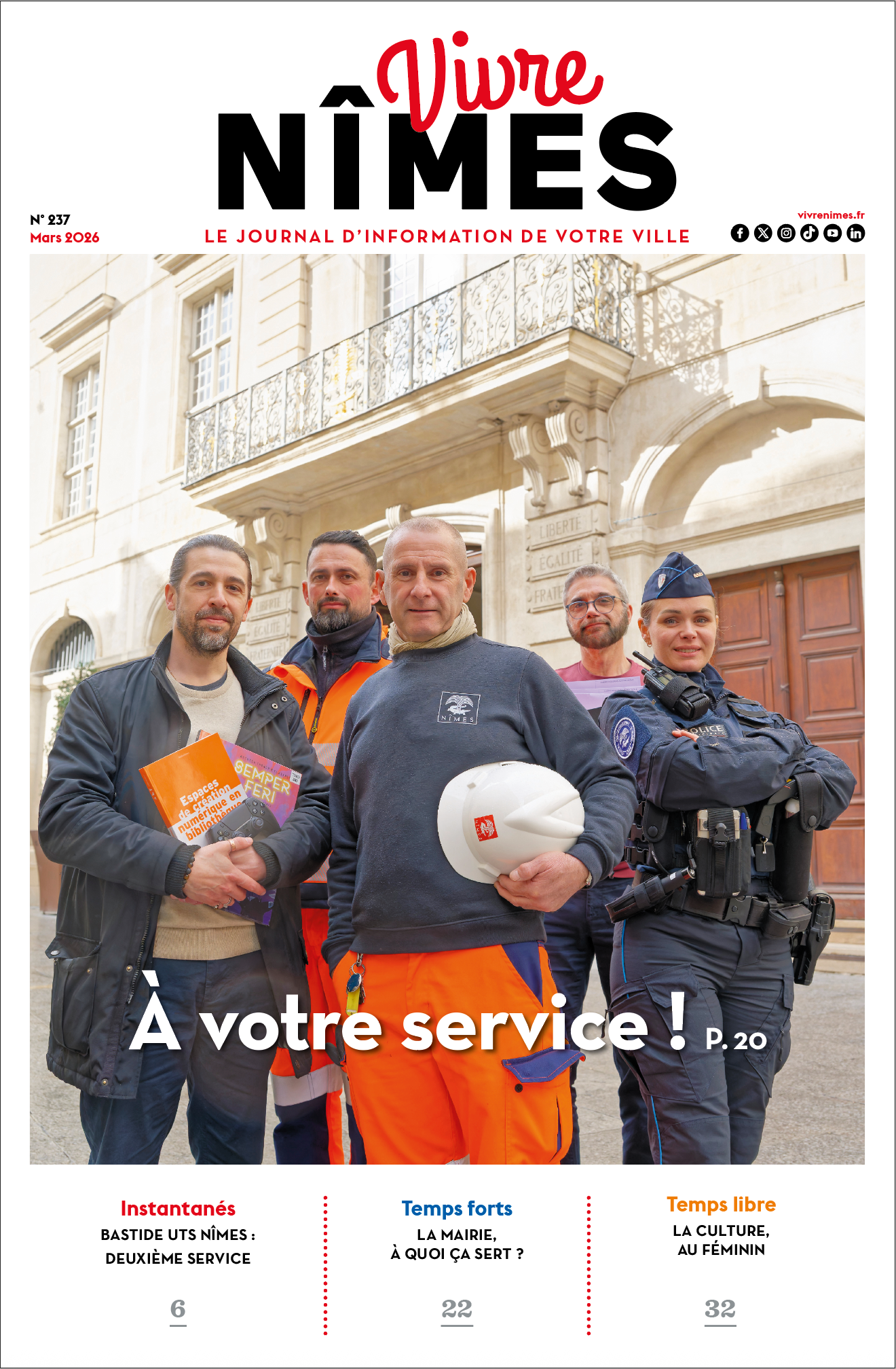 Le numéro 237 de Vivre Nîmes, daté de mars-avril 2026, propose une nouvelle édition du magazine municipal d’information. Cette parution met en avant un dossier central consacré aux grandes manifestations et au rayonnement culturel de la ville, avec un focus sur les événements emblématiques qui animent le printemps nîmois. Le magazine revient également sur les projets d’aménagement, les actions en faveur du cadre de vie, de la sécurité et de la transition écologique, ainsi que sur la vie associative et sportive. Reportages, portraits, agenda et informations pratiques complètent ce numéro, offrant une information claire, accessible et ancrée dans le quotidien des Nîmoises et des Nîmois.