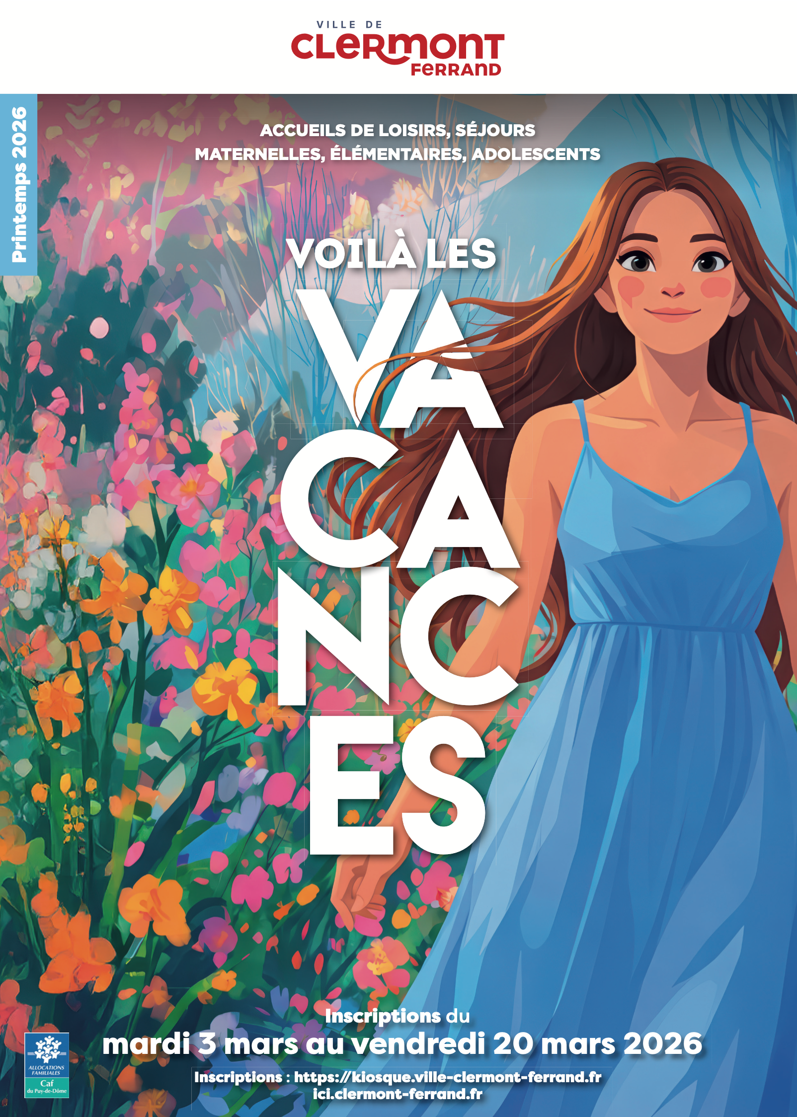 Cette brochure institutionnelle présente l’offre de la Ville de Clermont-Ferrand pour les vacances de printemps 2026 à destination des enfants et des adolescents, de la maternelle à 17 ans. Elle détaille les accueils de loisirs en ville, l’accueil de loisirs de Theix et plusieurs séjours à Super-Besse et à Ker Netra, avec des activités éducatives, sportives, artistiques et de plein air adaptées à chaque tranche d’âge. Le document intègre également l’ensemble des informations pratiques nécessaires aux familles : calendriers, modalités d’inscription, tarifs et aides financières.